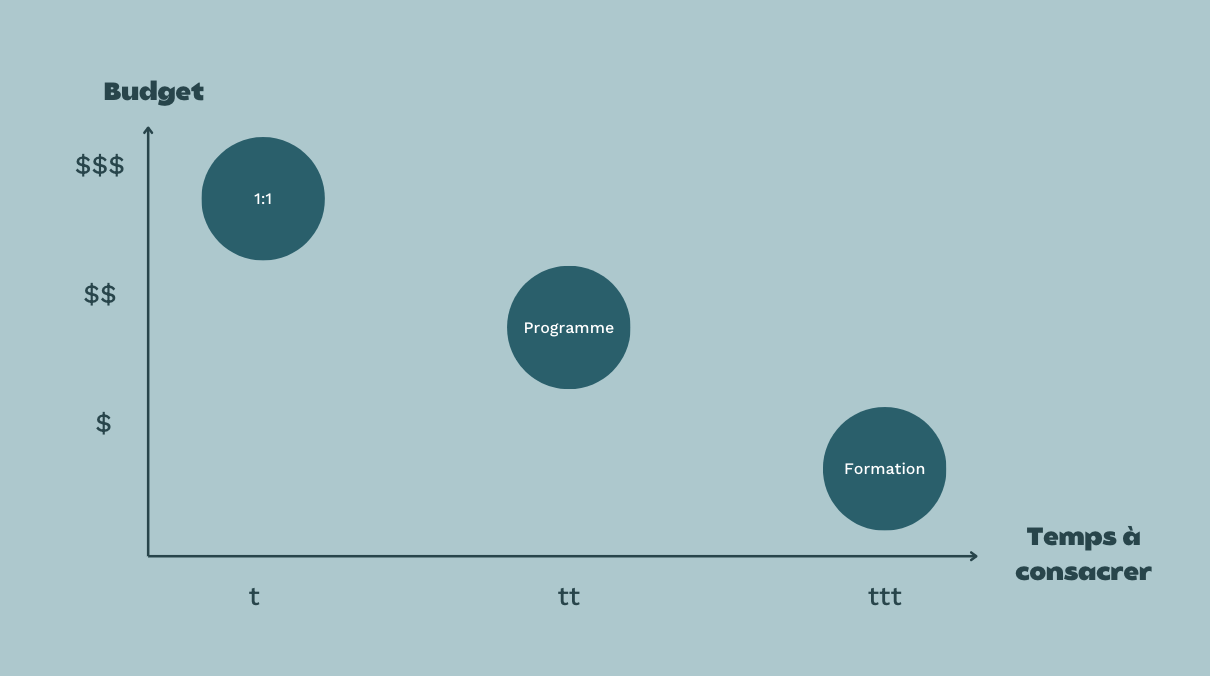 Si tu estimes que tu n'as pas de budget et du temps, prends la formation. Si tu as du budget et du temps, prends le programme. Si tu as du budget et mois de temps, prends un accompagnement 1:1.
